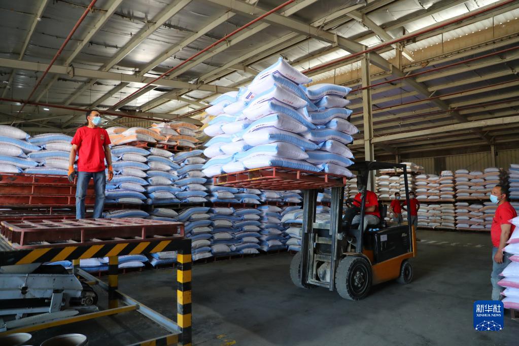 在坐落埃及米努夫省萨达特城第七工业开发区的一家中资鸡饲料出产企业,当地工人正忙着将加工好的饲料装载到排队等候的货车上。这些饲料将被源源不断地运往埃及的饲养场,为当地饲养业开展供给助力。